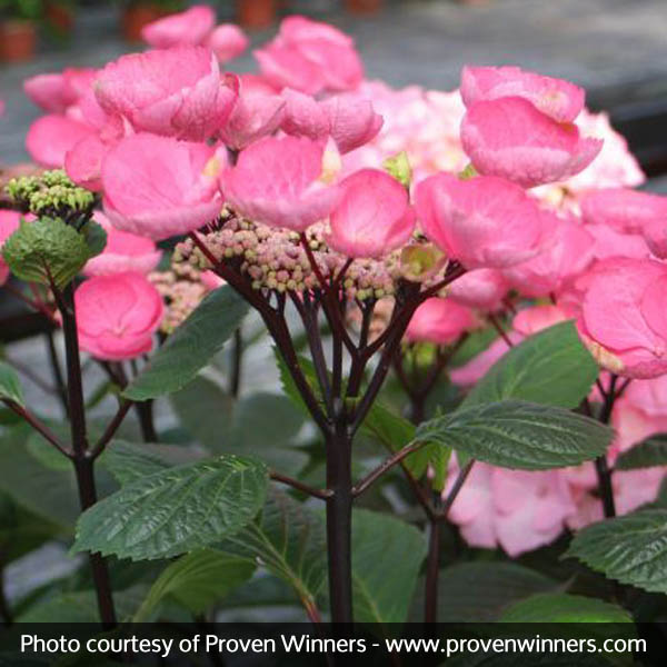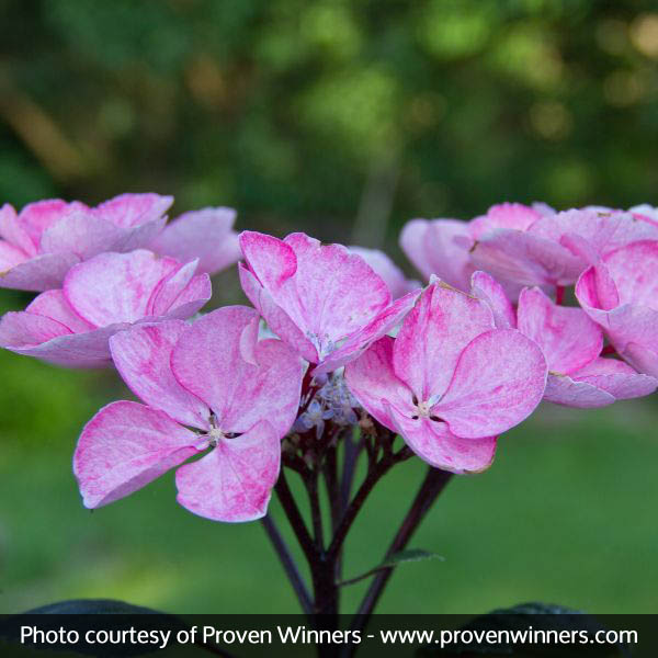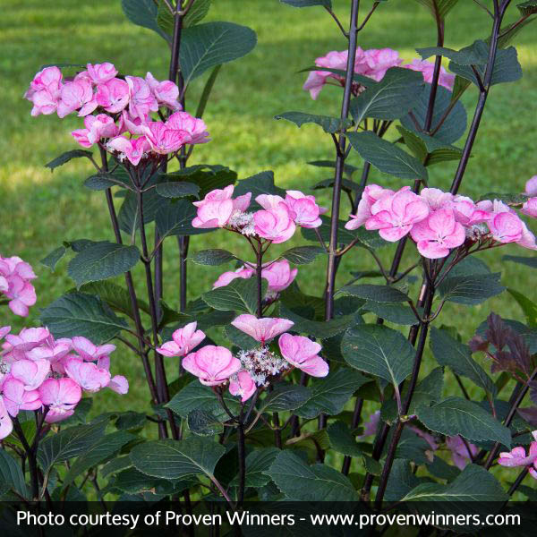 Everyone needs a touch of whimsy in their summer garden. Abracadabra Star Hydrangea,Hydrangea macrophylla ‘Horabstra’, provides that for you in spades. Soft, pink and white, bi-color flowers pop out of black wand-shaped stems, just like a magician’s trick. As the flowers age they turn a deep hot-pink.
