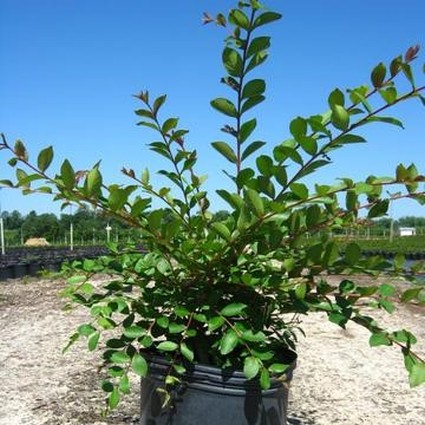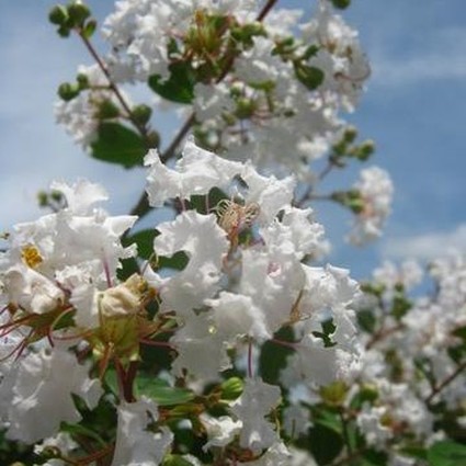 Crape Myrtles are often tree-like, but Acoma is a nice rounded shrub. This means that when it is pruned into a tree form (as it is most often) it has a full head that can be wider than it is tall, giving the shrub a stunning bouquet-of-flowers look. The pure-white crinkled and ruffled flower clusters hang a little lower than other Crapes, to a very romantic effect.