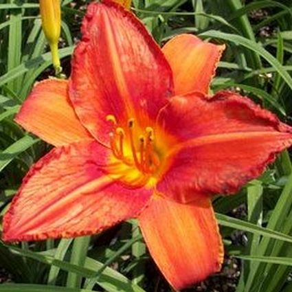 Daylily Alabama Jubilee, Hemerocallis ‘Alabama Jubilee’ boasts spectacular 7″ flowers which are fluorescent red-orange with a brighter red halo and greenish throat. This remarkable daylily is an excellent grower with healthy pest resistant foliage and sturdy scapes with over 25 buds each! Blooms appear in early to mid-season and put on a spectacular show for over four weeks.