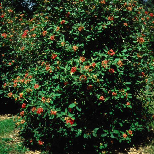 Alleghany Viburnum, Viburnum x Rhytidophylloides ‘Alleghany’, is a dense, compact rounded shrub with abundant, yellow-white flowers in spring. It is then followed by brilliant red fruit in fall, that matures to black in winter.