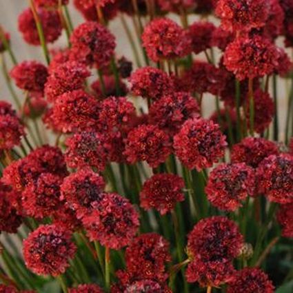 Armeria Ballerina Red (False Sea Thrift), Armeria pseudarmeria ‘Ballerina Red’, will show off its abundance of bright red flower clusters from mid through late spring. It will rebloom sporadically throughout the summer months if deadheaded.