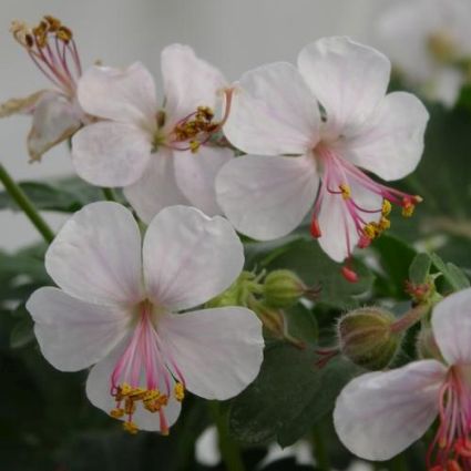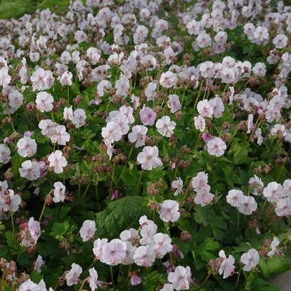 The Geranium ‘Biokovo’, Geranium x cantabrigiense, produces white flowers with light pink veins and stamens.