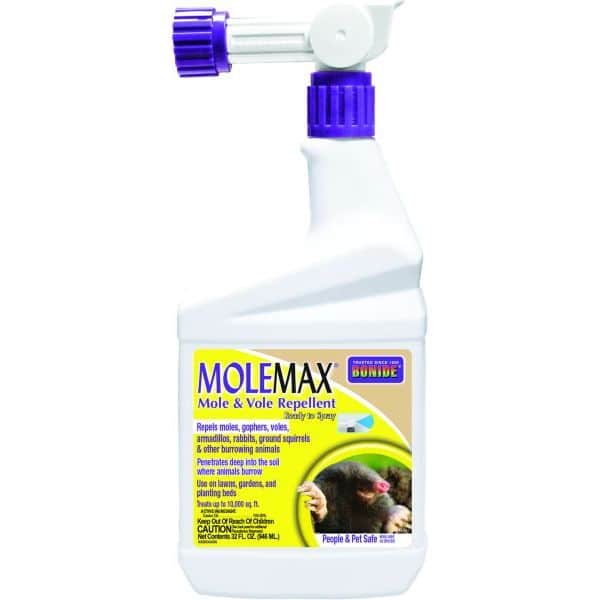 MoleMAX® is designed to repel moles, voles & gophers from your lawn or garden. Formulated to penetrate the soil, MoleMAX makes a treated area unpleasant for burrowing animals, resulting in long term control of those damaging burrowing animals. While primarily targeting moles, voles and gophers, the product can also be used to repel armadillos, rabbits, and ground squirrels. Each quart of liquid will treat 10,000 sq. ft.