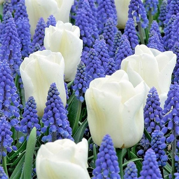 This blend is made up of two different types of flowers, Muscari armeniacum, and Tulip Concerto, Kaufmannanian-Greigii Tulia Concerto’. The Muscari has the classic bells on a panicle the shade of a twilight sky while the Concerto adds a little elegance with its pure white petals.