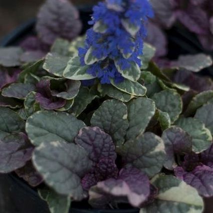 Burgundy Glow Bugleweed, Ajuga reptans ‘Burgundy Glow’, is a herbaceous perennial ground cover with short spikes of decorative blue flowers.
