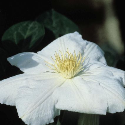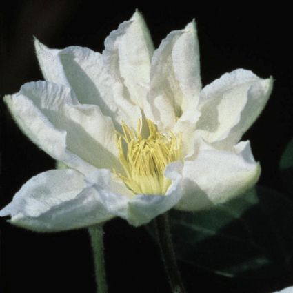 Clematis Candida, Clematis lanuginosa ‘Candida’, features pure white, 6″ flowers with creamy white to yellow stamens that adorn this vigorous selection in early summer and again in late summer.