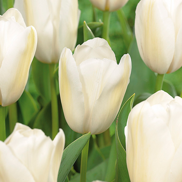 This cream-cheese white tulip boasts being one of the tallest white tulips you can find. This Single Late is stately, demure, and statuesque. Its color can vary slightly from pure snow white to ivory, and it often exhibits golden highlights.