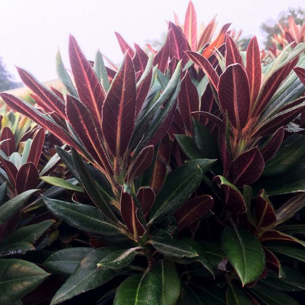 Each glossy, dark green, ovate leaf is brushed with a deeply delicious, Merlot wine-colored underside. No matter what time of year, this compact broadleaved evergreen beauty is absolutely stunning.