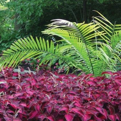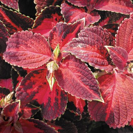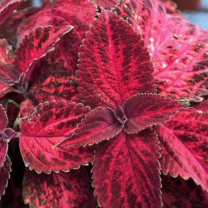 The Coleus Kingswood Torch, ‘Coleus hybrid’, has flaming magenta foliage that is overlaid with orange and burgundy. These new, bigger, sun loving varieties have revolutionized contanier gardening.