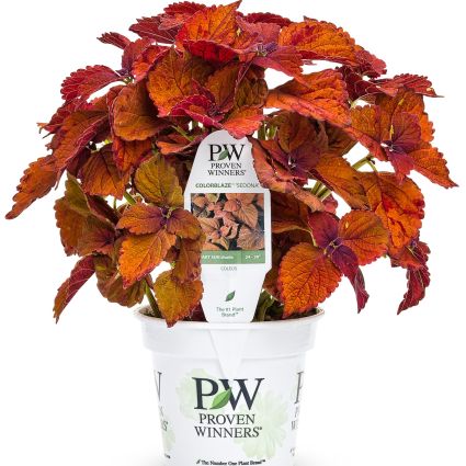 The Coleus Sedona, ‘Coleus hybrid’, has very unique russet colored foliage. These new, bigger, sun loving varieties have revolutionized contanier gardening. The brilliant colors explode in sunny locations.