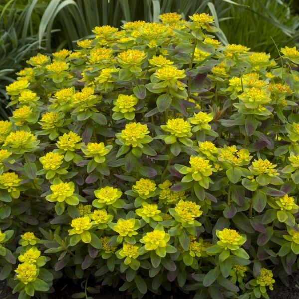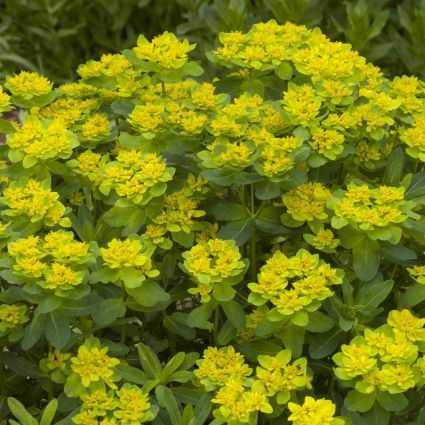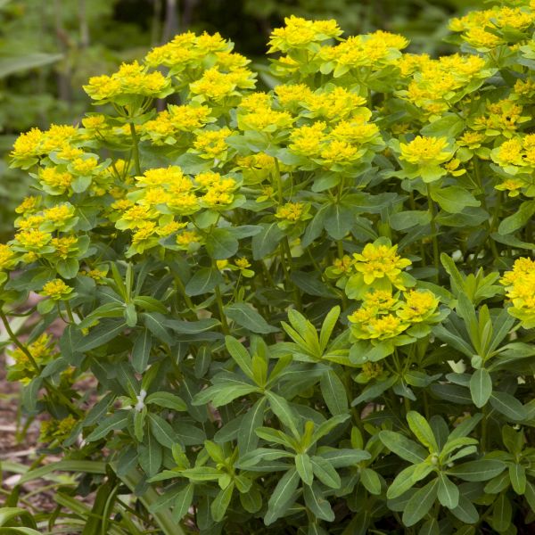 Cushion Spurge, Euphorbia Polychroma, is a mounding, clump-forming perennial which typically grows in a dome shape. It has clusters of poinsettia-like flowers, although the flower cymes are not showy, they are subtended by long-lasting, bright sulfur yellow bracts, which cover the plant and provide quite a show. It blooms so long that you can enjoy its bright yellow flowers for weeks.