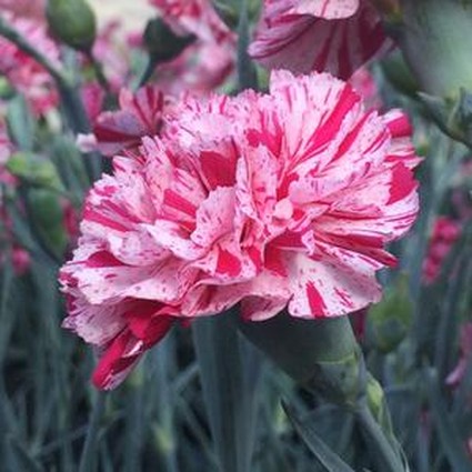 Pinball Wizard starts blooming in the spring with masses of fancy, white and hot-pink striped flowers on top of gorgeous blue-silver foliage. The flowers are double, looking more like Carnations than not. They bloom steadily all the way until fall on strong stems that are just begging to be cut. They have such a strong spicy, clove scent, you’ll want to pick armloads to bring inside.