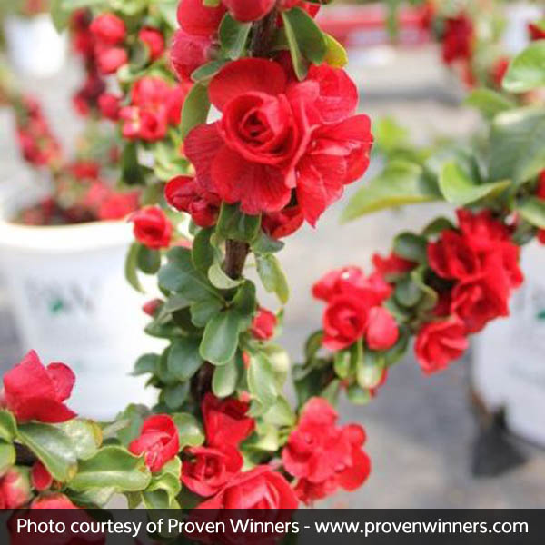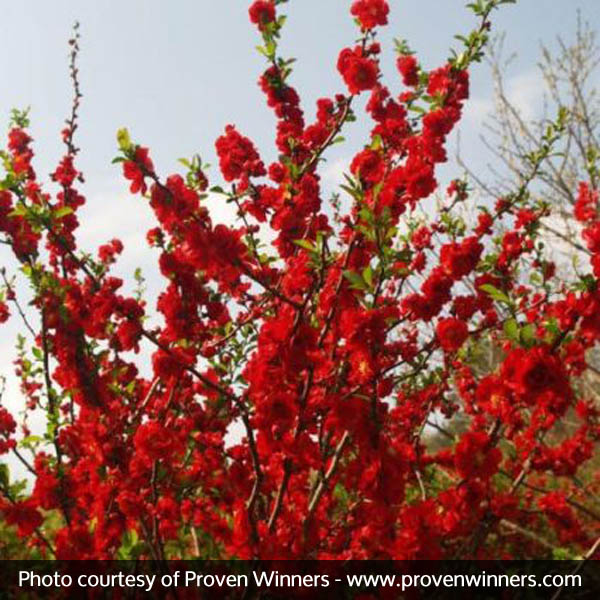 Double Take Scarlet™ Quince (Chaenomeles speciosa ‘Scarlet Storm’) is an improved variety that works beautifully many places around your landscape. This variety features amazing, double dark red flowers that absolutely cover the stems from top to bottom.