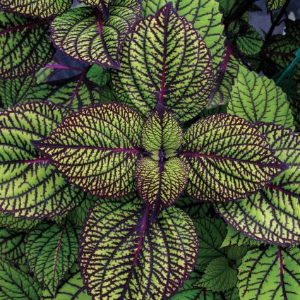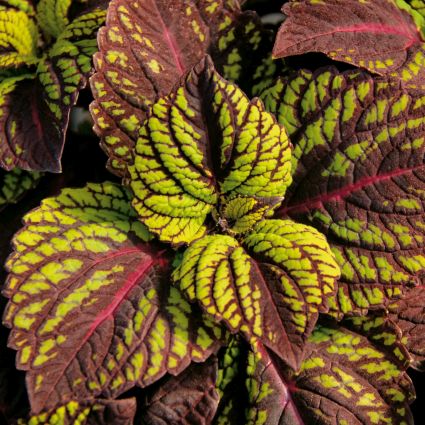The Coleus Fishnet Stocking, ‘Coleus hybrid’, has lime green foliage with bright burgundy veins on the entire leaf. These new, bigger, sun loving varieties have revolutionized container gardening.