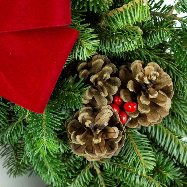 We’ve generously sprinkled natural pinecones, cute little faux winterberries and tied it off with a very festive Holiday Red Velvet bow.