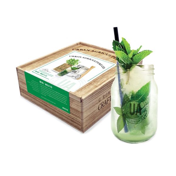 The Urban Agriculture Mint Mojito Herb Kit is an easy-to-grow, DIY craft cocktail kit that includes a pack of organic mint seeds (enough for multiple sowings), organic soil and a hip, urban container. It also includes a turned wooden muddler, a chic Mason jar cocktail shaker and a straining spoon. Los Angeles based master mixologist Harry Chin created a special Mint Mojito recipe that makes the most out of your fresh mint and we’ve included it in the kit.