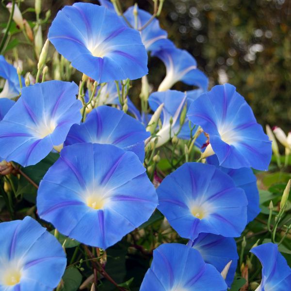 The flowers of the Heavenly Morning Glory are sky-blue with a white throat. They will bloom from summer until fall frost.