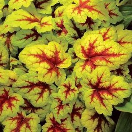 Heucherella Stoplight, Heucherella ‘Stoplight’ (PP#16,835), will cause you to stop momentarily to admire its colorful beauty in your landscape! The radiant yellow leaves of Heucherella ‘Stoplight’ have a large, dark red blotch in the center which feathers out through the veins. It is an improved version of Heucherella ‘Sunspot’ (PP#14,825).
