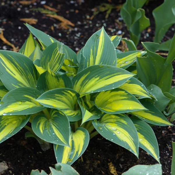 Hosta High Society, Hosta ‘High Society’ (PP#17,313), is a classy sport of Hosta ‘June’. This compact beauty emerges in spring with a narrow, yellow center and wide, powder blue margins.