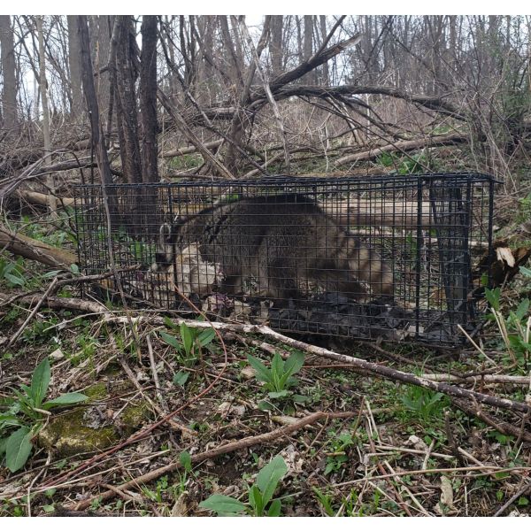 The gravity action door with two spring loaded latches allows for fail proof capture. The trap also features a handle to easily transport animals.