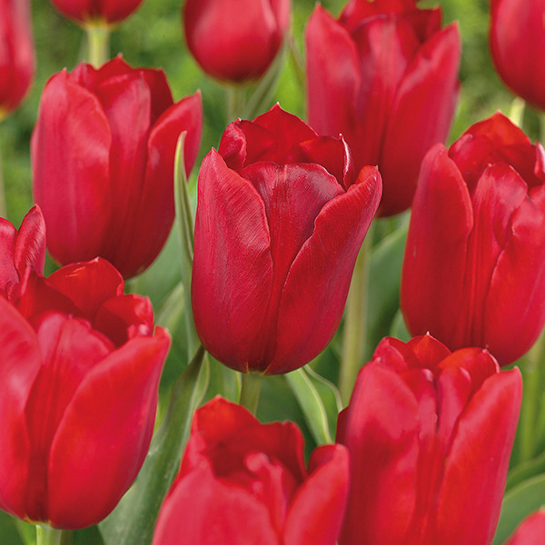 It’s easy to see why this tulip’s reign has lasted nearly 7 decades–it’s cherry red coloration is bright, bold, and deeply saturated, and its form is both regal and sophisticated. The Kingsblood Tulip’s blooms are goblet-shaped, and each petal neatly folds inward, terminating at a pointed tip. In fact, this tulip’s flower shape is reminiscent of a king wearing a crown.