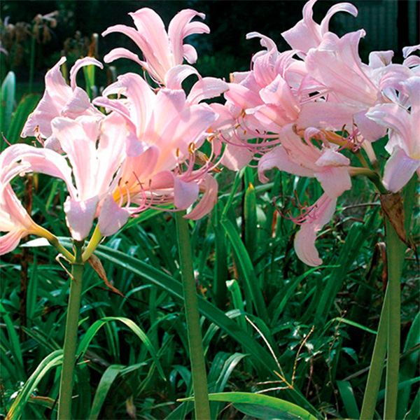 As her names imply, the Magic Lily truly is mystical. Its narrow straps of foliage begin to droop then within days, it sends up a spike at rapid speed and before you know it, you have an entire umbel of huge powder pink blooms. And these balloon-sized blooms are magical in their own right. These large trumpet-shaped blooms have six broad and reflexed petals that often have accents of purple and lavender and honey yellow throats. Each umbel typically produces several blooms that reach outwards in a radiant crown. And if the sun hits them just right, you can see their golden throats glowing from the inside out.