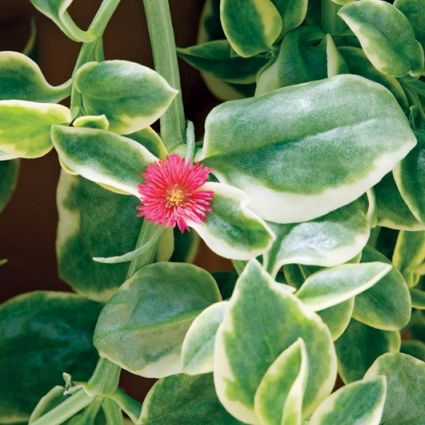 Mezoo Trailing Red is a glossy green succulent with cream margins that can be used as a groundcover or as a spiller plant in mixed containers and baskets.