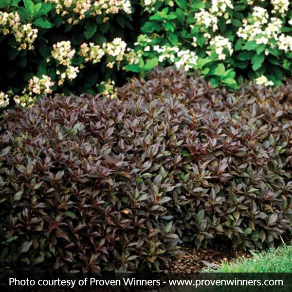 The Midnight Wine Weigela, Weigela florida ‘Elvera’, a Proven Winners selection, produces intense dark metallic purple-black foliage for season long interest and color.