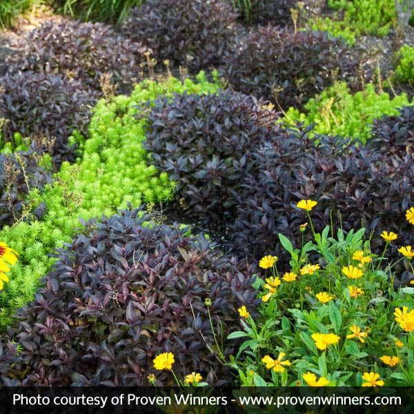 This weigela is loved for its consistently dark leaves, mounding habit, and low maintenance. For a brilliant contrast, try pairing it with yellow foliage companions!