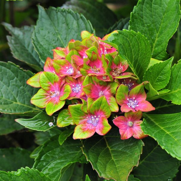 Would you like a Hydrangea with green flowers? Red flowers, or perhaps purple flowers? How about a hydrangea that displays all three! The Next Generation Pistachio Hydrangea, Hydrangea macrophylla NEXT GENERATION ‘Horwack’, is a one-of-a-kind hydrangea features stunning, 5-inch wide flower heads that begin their show in spring and continue right up into fall. Each dazzling, double floret is lime green with a dramatic splash of hot pink and a purple eye.
