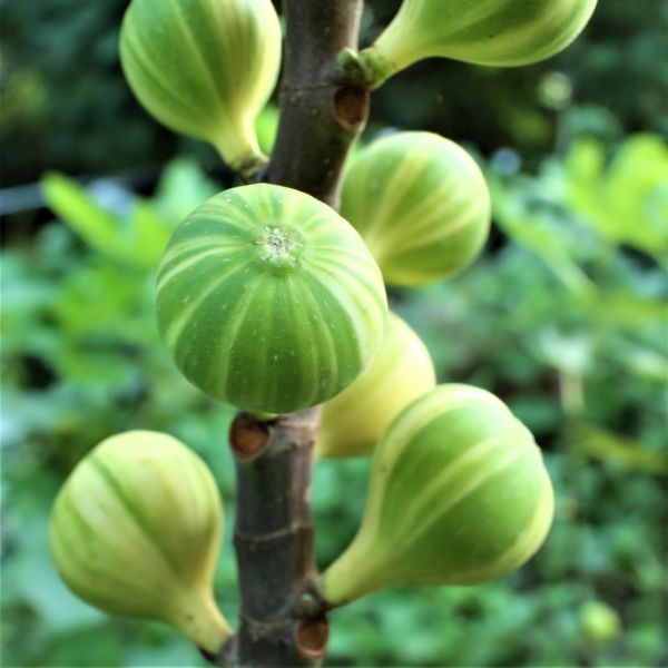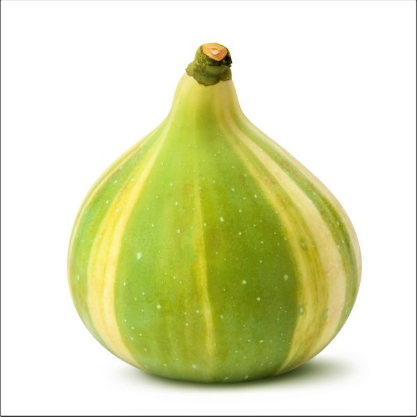 These figs are dressed for the party. They adorn themselves with bright green and yellow to cream variegated stripes that show off their juicy curves. And as they ripen, they celebrate the occasion with a wardrobe change from stripes to solid yellow then a finale of verdant green. With blazing red insides, these figs are just as beautiful as they are delectable!