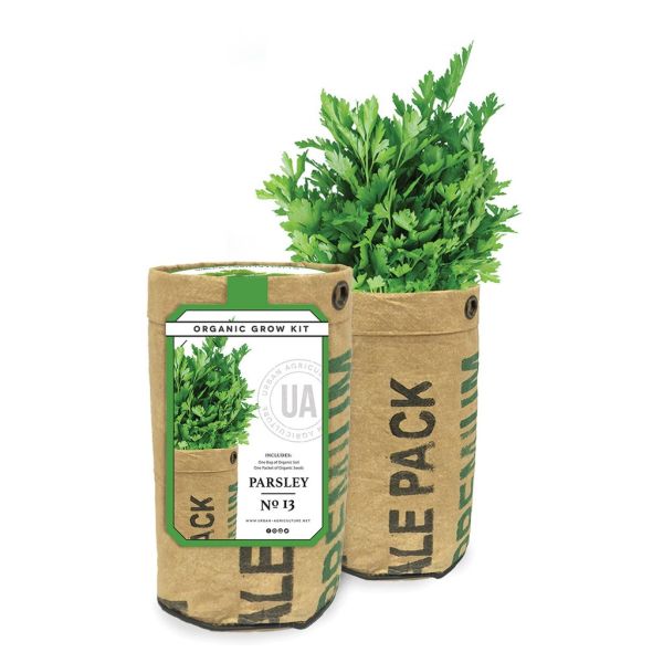The Urban Agriculture Parsley Kit is so easy to grow. The kit includes everything: a pack of organic parsley seeds, a bag of organic soil, a plant marker tag and a recycled tea bag container with a cute modern urban design.