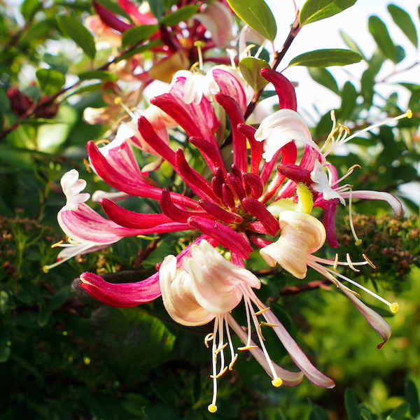 One of the very best, Peaches and Cream Honeysuckle (Lonicera periclymenum ‘Inov 86’) is a more compact and controlled form of Honeysuckle vine. It features deep, dark, maroon-colored buds that burst open to reveal exotic scarlet, peaches, pinks and cream-colored blooms.