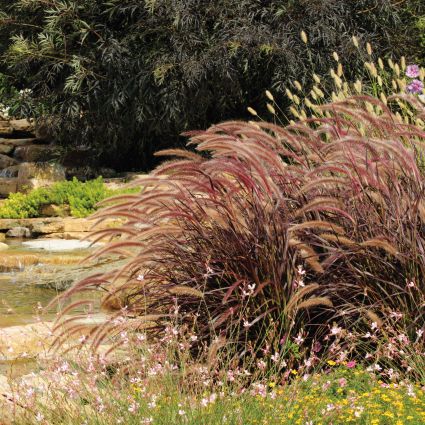 Purple Fountain Grass cascades into a fountain-like shape upon maturity, giving rise to its name. In summer, the tall stems of Purple Fountain Grass soar above its foliage, reaching up, and tipping its foot-long matching burgundy plumes. As the days go by, these plums form an arch and turn a tan color that persists into the early days of autumn.