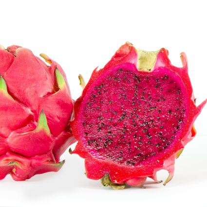 The Red Dragon Fruit produces pitayas that have bright red skin with thin, pliable yellow tabs when ripe. The fruit remains bright green until ripening. While interesting and attractive, the Red Dragon Fruit’s flesh is even more stunning. When you cut open the Red Dragon Fruit, you’ll find bright magenta flesh speckled with edible black seeds.