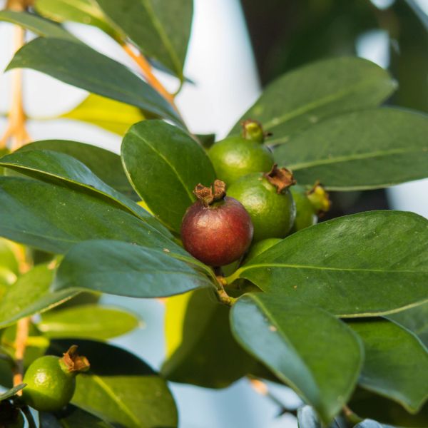 This plant won’t just provide you with plenty of fruit, it will also gift your garden with beauty. It has layers of shedding bark and foliage that is deep red hidden beneath the green topsides. This foliage will blush to complete red in cooler winters. And the Red Malaysian Guava produces a flurry of puffy pink and white flowers with pompoms of stamens in summer.