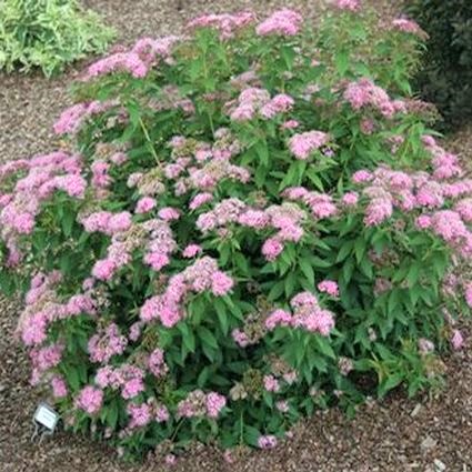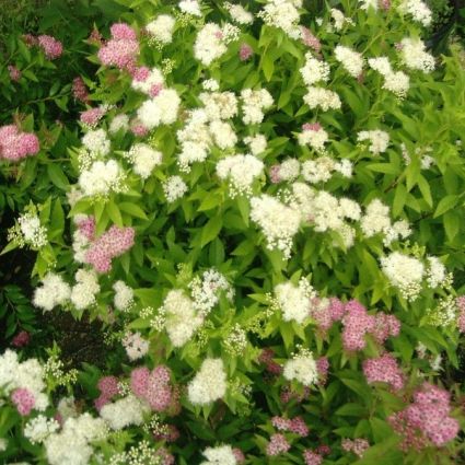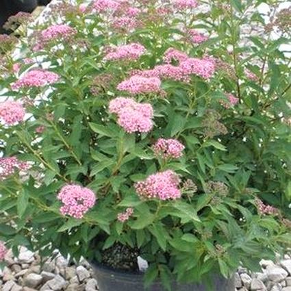 It is a well-branched plant with flowers forming flat clusters by mid-June, ranging from a mixed pink to white. This dense, mounded shrub has medium-green leaves that are oval and toothed.