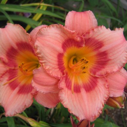 The Hemerocallis ‘Strawberry Candy’, also known as a Daylily, has a wonderful color of a strawberry-pink blend with a rosy-red eye zone, a golden green throat, and ruffled edges.