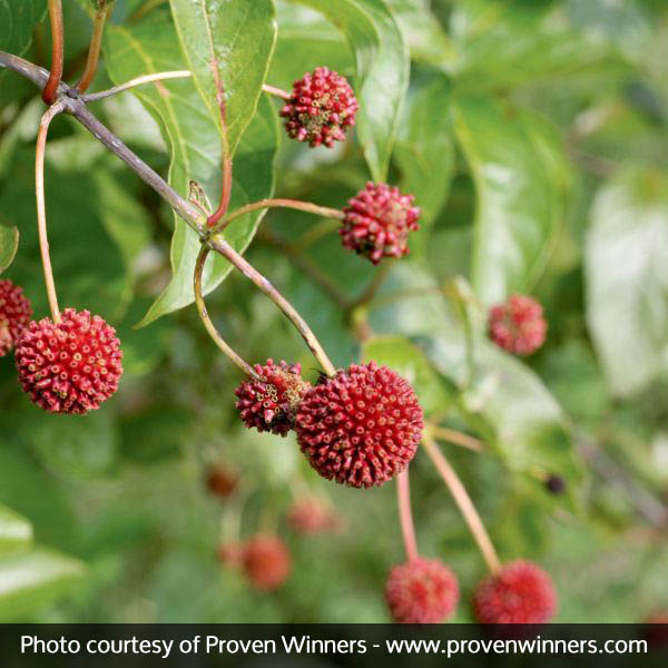 Butterflies and bees will flock to your little balls of floral brilliance for their sweet scent, and birds will love the small, red balls that they transition to in late summer. When the excitement of your Sugar Shack has passed for the year, it will still provide some winter interest with its attractive branches and sometimes twisting stems.