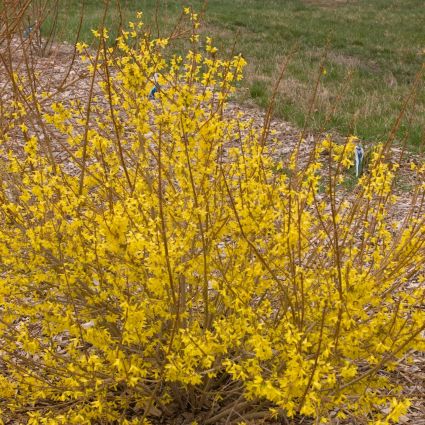 Sunrise Forsythia can easily become a wonderful feature in the lawn as well. Use three in an informal grouping. Vary the spacing from 3 – 5 feet apart on center. Measure from the center of one to the center of the next and create a loose triangle for the best results.