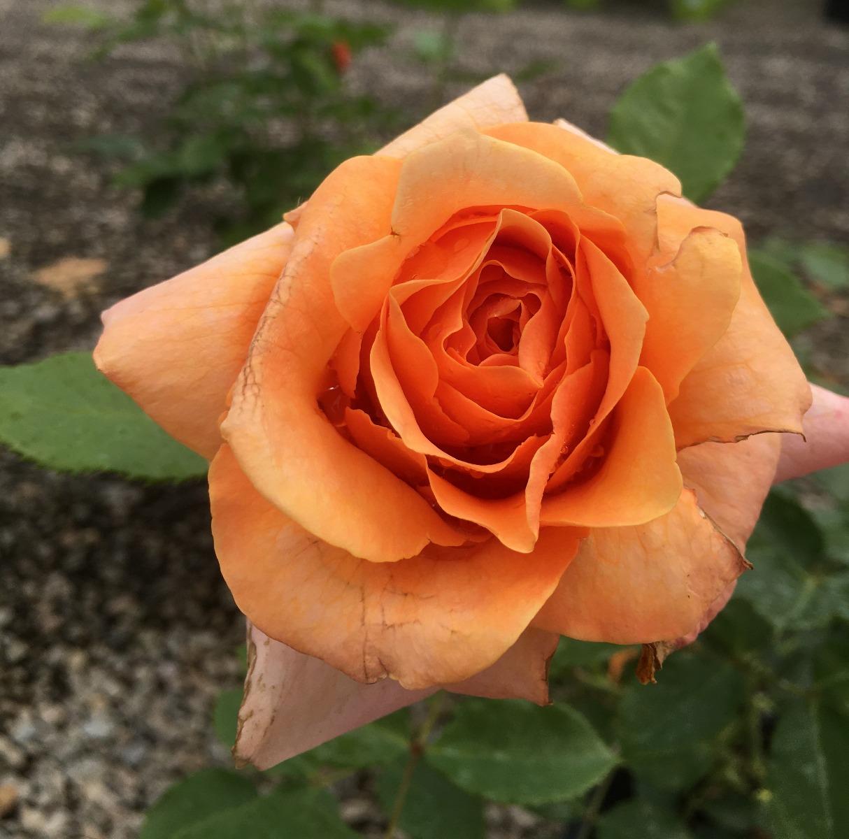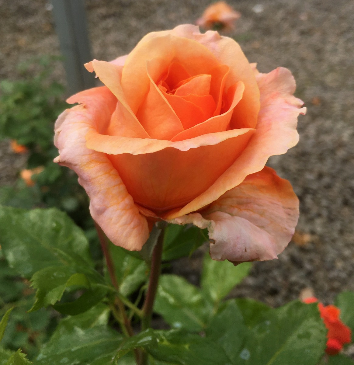 This spectacular rose seemingly changes color in front of your eyes. It goes from a peachy dream to a tangerine daydream as the sun plays on its petals.