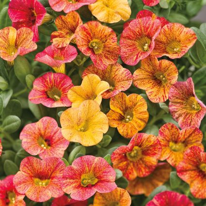 This vigorous, fast growing plant produces hundreds of petunia-like flowers that are painted in a sunny mix of orange, red, and yellow. They bloom from spring until first frost.