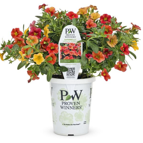 Calibrachoa Superbells Tequila Sunrise, Calibrachoa ‘Tequila Sunrise’ PPAF, is a Proven Winner® plant, has undergone rigorous testing to be sure that it will perform in the garden under a variety of conditions. It has orange blooms with splashes of red. Superbells® has a semi-upright growth habit, and larger leaves than other Calibrachoas, making it a great choice for hanging baskets, containers, and window boxes.