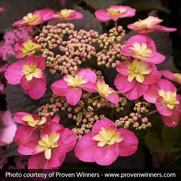 Deep pink and chartreuse green blooms cover the bush in early summer and re-bloom through fall. (More acidic soils will make the blooms purple/blue.) The bloom clusters form mounds and are held high on the strong stems. The full sized flowers are born on compact plants that make this a very versatile shrub for you landscape. Besides being a great specimen plant it also is perfect for borders, hedges and mixed gardens.