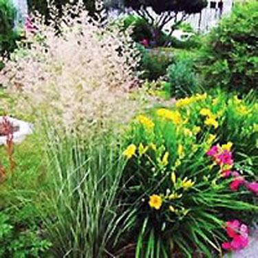 It provides an excellent vertical accent for borders and for narrow spaces in the landscape. It is also effective in moist low spots or on pond/stream banks. Variegated Feather Reed works well as a specimen, or incorporated into a border and makes a good low screen, especially in somewhat shady areas.