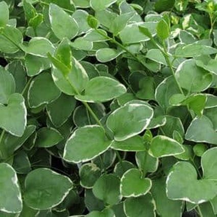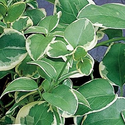 This Vinca Vine is a trailing vine that grows green with white-edged leaves. Variegated Vinca vine will not climb surfaces, can be easily woven and trained upon a trellis or other structure if desired, or allow it to expand out in all directions.