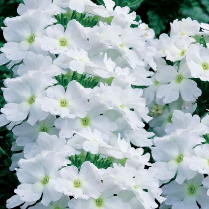 Verbena Lanai Blush White, Verbena Lanai® Blush White, has bright white flowers with pale yellow centers. Lanai™ flowers early and is free flowering from tip to crown. The flowers on this Verbena look wonderful and attract butterflies.