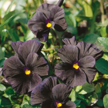 Violet Black Magic, Viola ‘Black Magic’, true to its name, has 1″ wide, solid matte black flowers with a tiny bright yellow eye. Young plants flowers are more dark purple and they will progress to black as the plant ages.