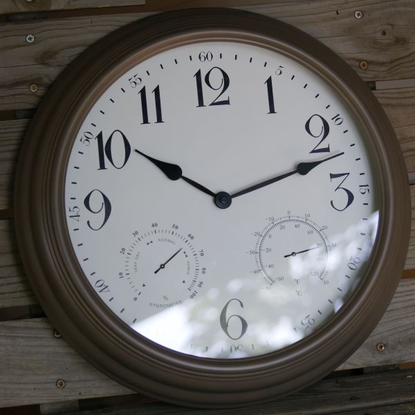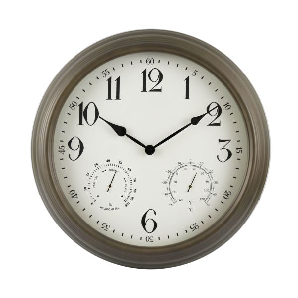 Instantly enhance any space with the 16″ Metal Indoor/Outdoor Wall Clock With thermometer and hygrometer. The simple design and durable construction of this clock make it a timeless piece that fits seamlessly in any indoor or outdoor space.