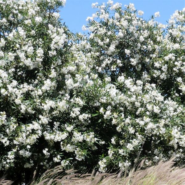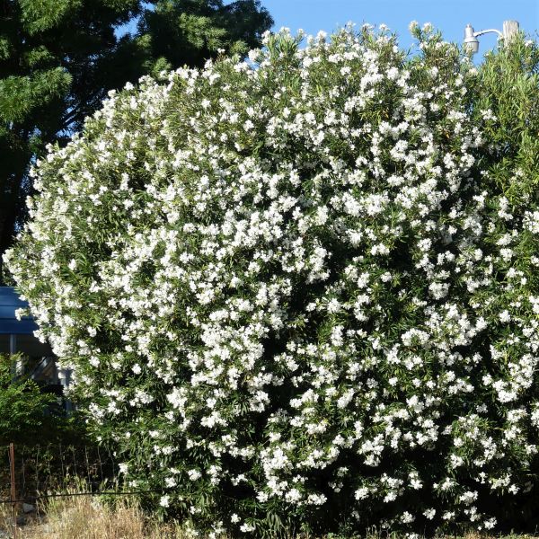 The White Oleander (Nerium oleander) celebrates the natural world with its full leaves and clusters of blooms. This broadleaved evergreen is sure to create a lush and rich verdant feeling for your garden.